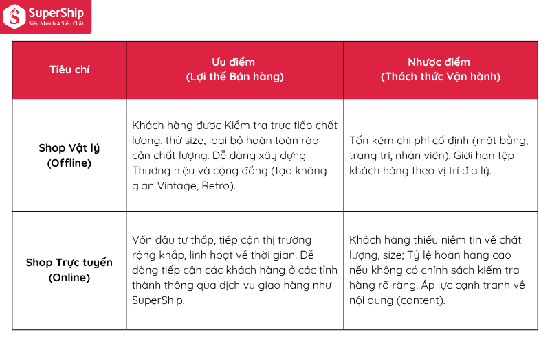 Thách thức cho Người Bán (Chi phí Xử lý & Vận hành): Chủ shop phải đối mặt với chi phí xử lý (giặt ủi, khử mùi, sửa chữa) làm giảm lợi nhuận. Đặc biệt, việc quản lý tồn kho (mỗi mẫu 1 cái) phức tạp và áp lực về giao nhận (khách hàng cần kiểm tra chất lượng) đòi hỏi shop phải có quy trình vận hành tinh gọn và chọn đối tác vận chuyển có chính sách hỗ trợ khách kiểm tra hàng như SuperShip.