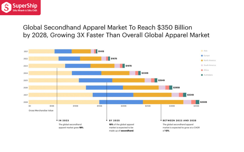 *Nguồn: Báo cáo mới nhất từ Thredup tiết lộ rằng thị trường thời trang second hand toàn cầu sẽ không ngừng lớn mạnh, dự kiến đạt giá trị lên tới 350 tỉ đô-la Mỹ vào năm 2028, với mức tăng trưởng hàng năm ổn định là 12%.