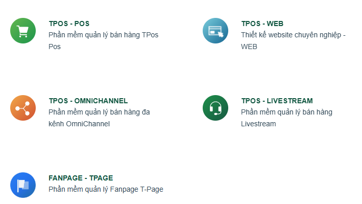 – TPOS – WEB: Cho phép doanh nghiệp dễ dàng tạo website bán hàng chuyên nghiệp, đa dạng mẫu mã mà không cần kiến thức lập trình phức tạp. Website được tối ưu SEO và tích hợp với các kênh bán hàng khác của TPos.