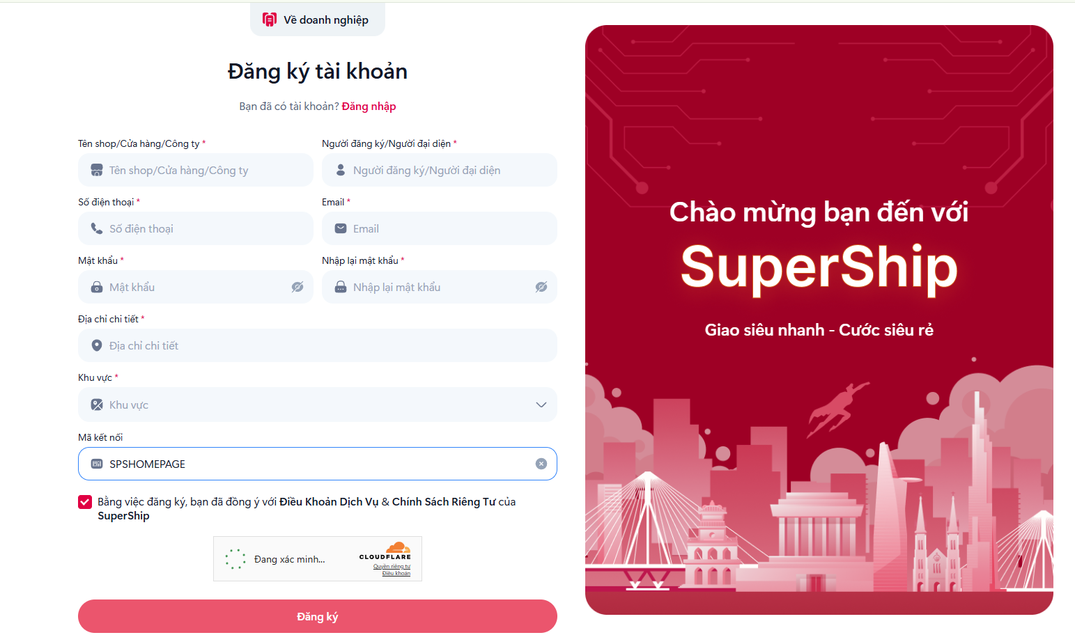 Đăng nhập/Đăng ký: Shop truy cập vào trang quản lý của SuperShip tại https://mysupership.vn/login. Nếu chưa có tài khoản, hãy thực hiện “Đăng ký ngay”.
