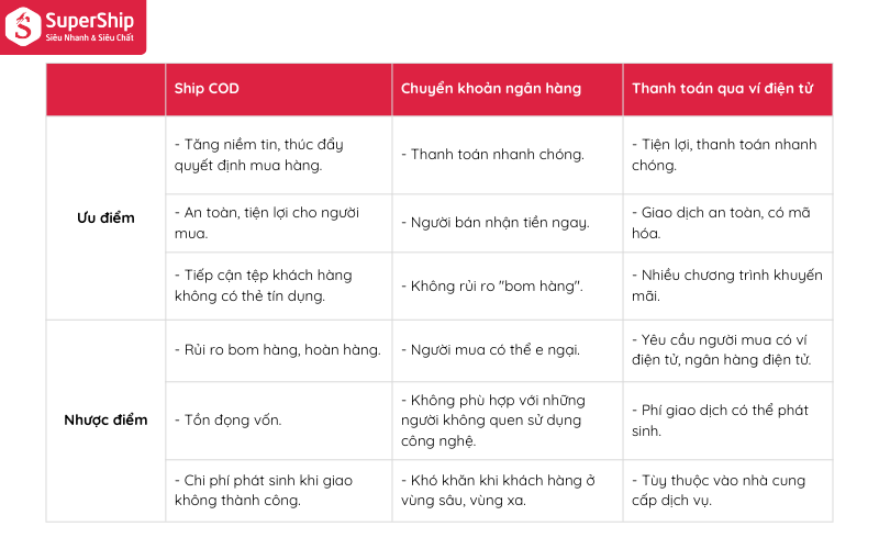 Có thể thấy, mỗi hình thức thanh toán đều có những lợi thế riêng. Ship COD vẫn là lựa chọn hàng đầu cho các shop online, đặc biệt là các shop nhỏ và mới, nhờ khả năng xây dựng lòng tin và thúc đẩy doanh số. Khi kết hợp với một đơn vị vận chuyển uy tín như SuperShip, rủi ro sẽ được giảm thiểu tối đa, giúp các shop kinh doanh hiệu quả và phát triển bền vững.