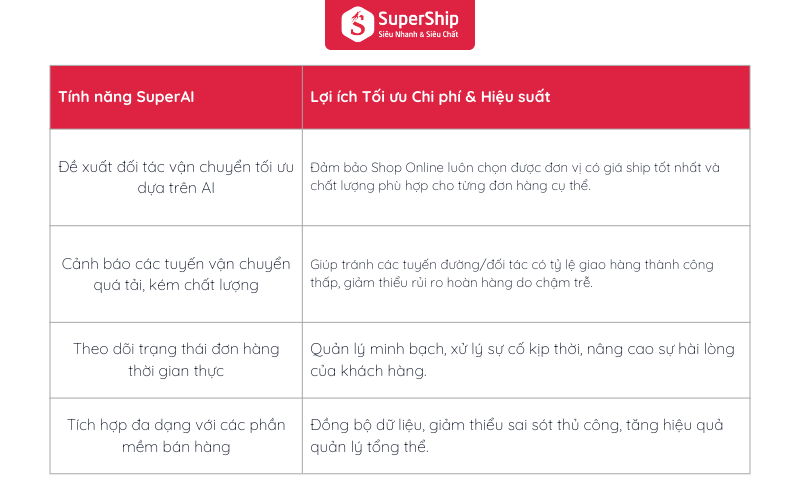 SuperAI cung cấp một loạt các tính năng giúp Shop Online đưa ra quyết định giao hàng thông minh, giảm thiểu rủi ro và tối ưu chi phí vận hành: