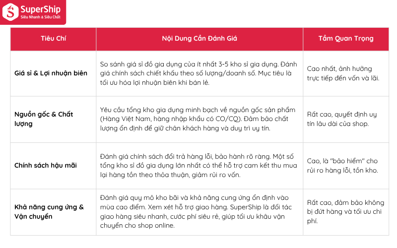 Trước khi quyết định hợp tác với bất kỳ tổng kho gia dụng nào, hãy sử dụng bảng tiêu chí “vàng” dưới đây để đánh giá toàn diện, đảm bảo bạn chọn được nguồn hàng gia dụng chất lượng, giá tốt: