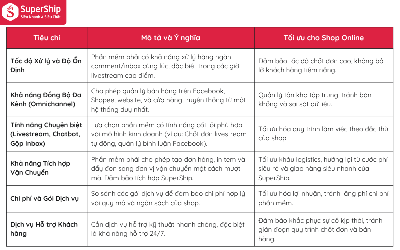 Việc lựa chọn phần mềm bán hàng Facebook không chỉ dựa trên giá cả mà còn phải xem xét sự phù hợp với mô hình kinh doanh của shop online. Đây là 6 tiêu chí vàng bạn cần cân nhắc: